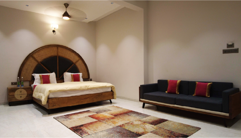 Welcome to our Vrindavan Suite, at Glory. Here, we've created a space that combines luxury with a serene atmosphere. The Vrindavan Suite is designed to make you feel pampered and comfortable. You'll find spacious interiors filled with cozy furniture and stylish decorations that reflect the peaceful vibes of Krishna's realm.