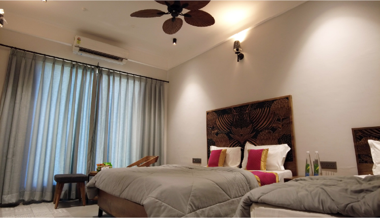 Bask in the serene ambiance of the room, where soft lighting and soothing colors create an atmosphere of tranquility. With round-the-clock assistance and amenities like air conditioning for your comfort, we ensure that your experience is seamless and enjoyable. Whether you're lounging in the comfortable seating area or resting in the luxurious bed, the Gokul Suite invites you to relax and rejuvenate in style. Welcome to a retreat inspired by the beauty and serenity of Gokul, where every moment is infused with warmth and hospitality.